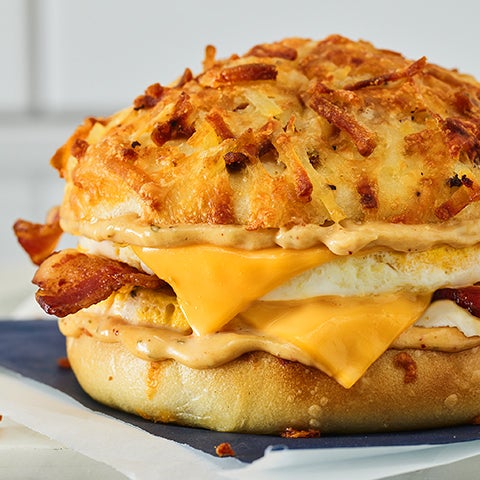 Bacon. Cheese. Egg. Repeat! Cage-free eggs with bacon, American cheese and smoky chipotle aioli on a fresh-baked Cheesy Hash Brown Gourmet Bagel.​